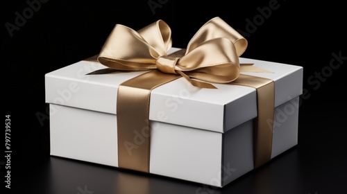 © Miva, Obraz premium Elegant White Gift Box with Glossy Golden Ribbon on a Black Background