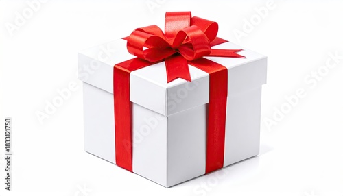 Obraz premium Elegant White Gift Box with Red Ribbon and Bow Isolated on White Background.