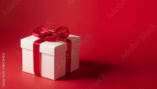 © Orandlas, Fototapeta premium Elegant white gift box with red ribbon on monochromatic red background