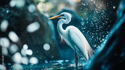 © Juan, Fototapeta premium Elegant white heron standing near a river with soft lighting