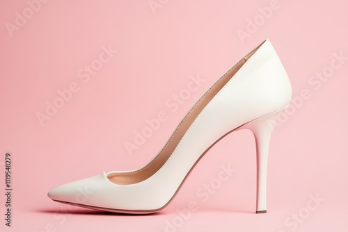 © saleem, Obraz premium Elegant white high heel shoe against a soft pink background showcasing modern footwear design