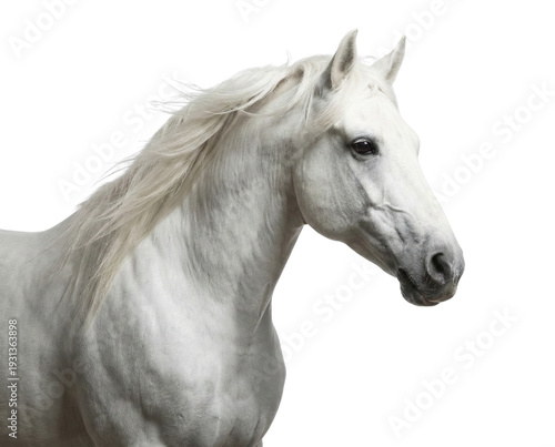 © Farzana, Obraz premium Elegant White Horse Head and Neck Isolated on White Background