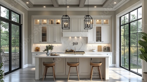 Fototapeta premium Elegant white kitchen featuring an agent arranging decor for a blog setup,...