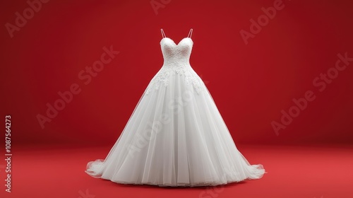 © Arbystudio, Obraz premium Elegant White Lace Wedding Gown on Red Background