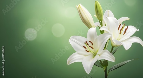 Fototapeta premium Elegant white lilies against a soft green background with bokeh highlights beautiful