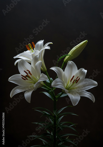 Fototapeta premium Elegant white lilies blooming on a dark background, creating a minimalist and...