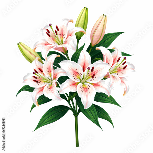 © NguynTh, Naklejka premium Elegant White Lilies Bouquet with Green Leaves