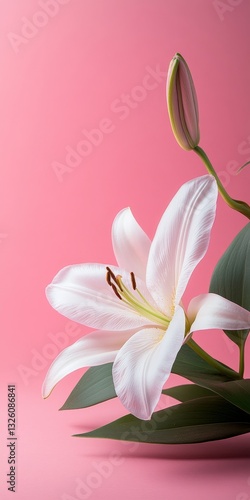 © Ilja, Fototapeta premium Elegant White Lily Blossom on Pink, Minimalistic Floral Photography, Copy Space for Text