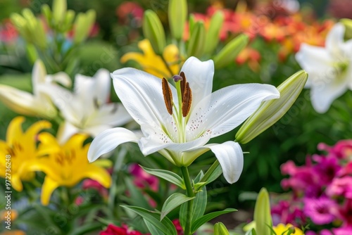 © Ilja, Fototapeta premium Elegant White Lily Flower in Full Bloom, Surrounded by Colorful Lilies in a Garden Setting
