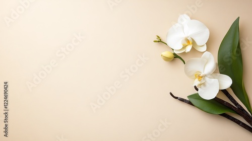 Fototapeta premium Elegant white orchids arranged on a soft beige background, showcasing...