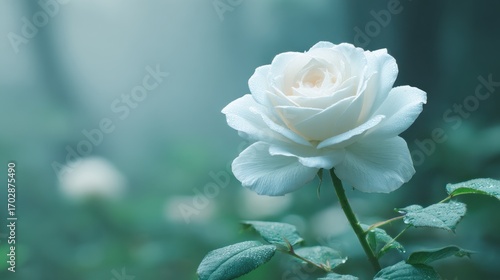© Qhalifah, Obraz premium Elegant White Rose Blooming in Enigmatic Misty Forest Environment