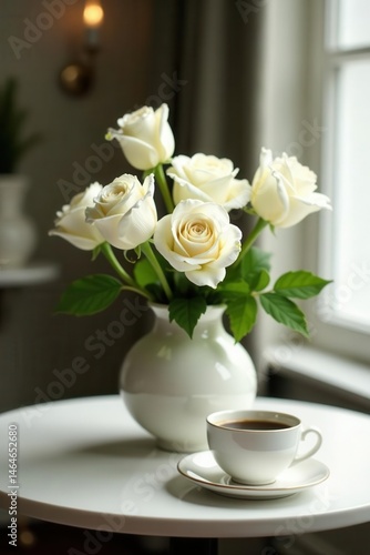 © jarin, Fototapeta premium Elegant white roses and lilies in round vases, coffee cups on table , kitchen, breakfast