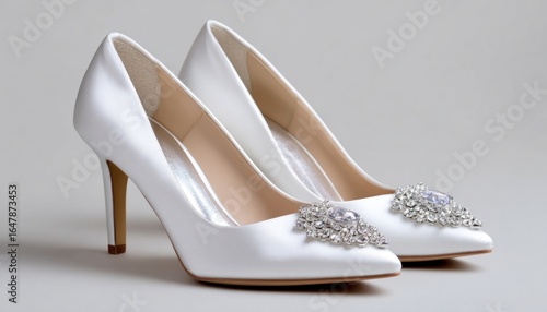 Obraz premium Elegant white satin bridal shoes with rhinestone embellishments on gray...