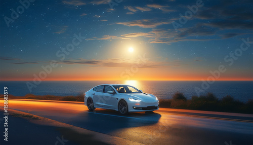 Fototapeta premium Elegant white sedan parked by the seaside during sunset with a picturesque...