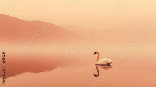 © Minimal & Cozy, Naklejka premium Elegant White Swan Gliding on a Tranquil Misty Lake with a Soft Peach Glow