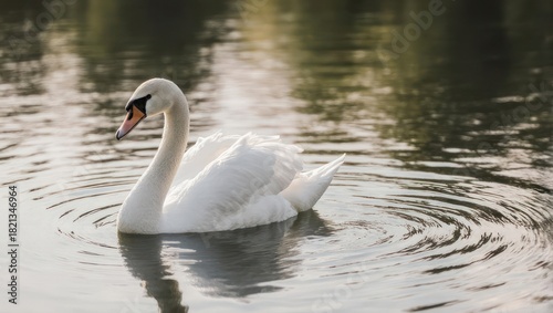 © Anik, Naklejka premium Elegant white swan gracefully swimming on a tranquil lake.