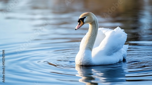 Naklejka premium Elegant white swan gracefully swimming on calm lake water reflecting the blue...