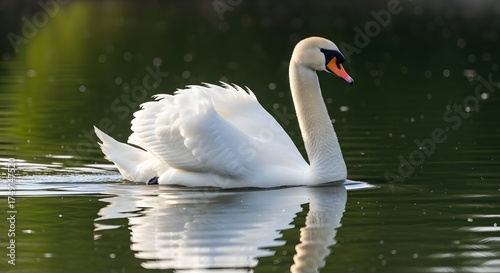 Obraz premium Elegant white swan swimming gracefully in calm water, reflecting sunlight on...