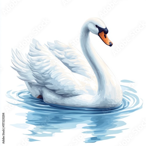 © Ronnakrit, Obraz premium Elegant White Swan Swimming Gracefully on Calm Blue Water Surface