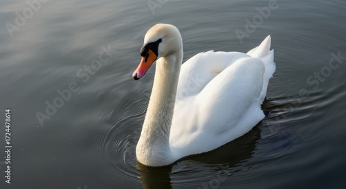 © galerymaregi, Fototapeta premium Elegant White Swan Swimming in Calm Dark Lake Water