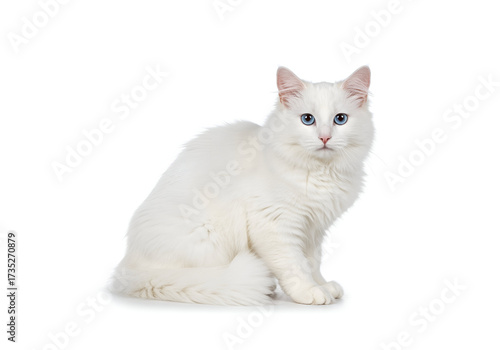 © isolatedpng, Fototapeta premium Elegant white Turkish Angora cat with striking blue eyes sitting gracefully against a clean white background, a serene and photogenic feline