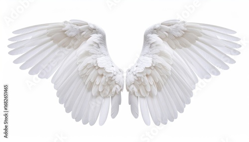 © Growth, Naklejka premium Elegant white wings, intricately detailed feathers fanned out against a clean white background, creating a visual of lightness and ethereal beauty