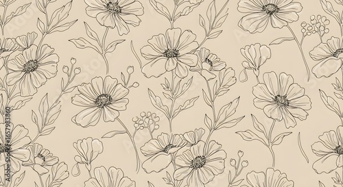 Fototapeta premium Elegant Wildflower Line Art A Seamless Botanical Pattern on a Soft Beige Canvas.
