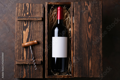© Александр Марченко, Fototapeta premium Elegant wine bottle in wooden box with corkscrew, perfect gift for wine lovers