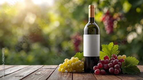 © Sanjaya, Fototapeta premium Elegant Wine Bottle with Empty White Label on Wooden Table – Premium Red and White Wine Display with Outdoor Blur Background