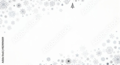 Fototapeta premium Elegant winter holiday background with delicate snowflakes and a small Christmas tree forming a diagonal border on a white backdrop