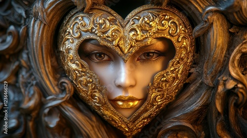 © Thavesak, Fototapeta premium Elegant woman face with ornate heart frame and golden accents