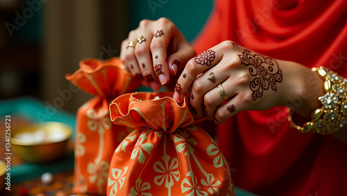 © Graphic Studio, Fototapeta premium Elegant Woman Hands with Henna Applying Jewelry into Orange Gift Bags Festive Celebration Indian Culture Traditional Design Beautiful Ornament