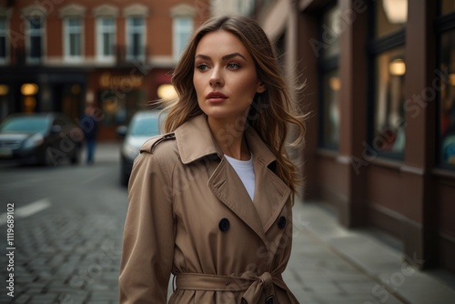 Fototapeta premium Elegant woman in trench coat wandering urban streets at sunset