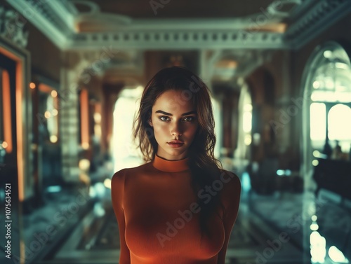 Fototapeta premium Elegant Woman Posing in Luxurious Hallway with Dramatic Lighting