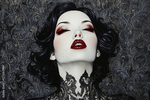 © ChaoticMind, Naklejka premium Elegant woman with dark makeup and intricate lace design against textured background
