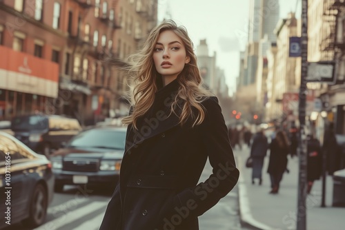 Fototapeta premium Elegant woman with flowing hair walking confidently through bustling city...