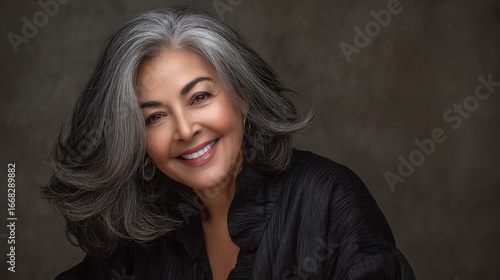 Fototapeta premium Elegant woman with silver hair smiles warmly, radiating confidence and grace in a studio portrait against a muted background.