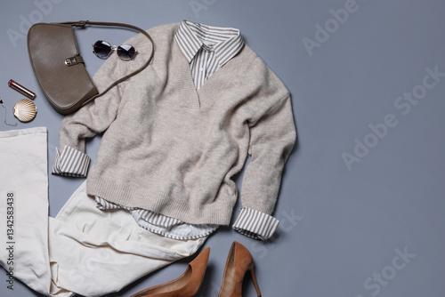 Fototapeta premium Elegant women's outfit. Stylish clothes and accessories on grey background,...