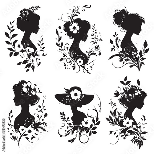 Fototapeta premium Elegant women silhouettes with floral designs white baground