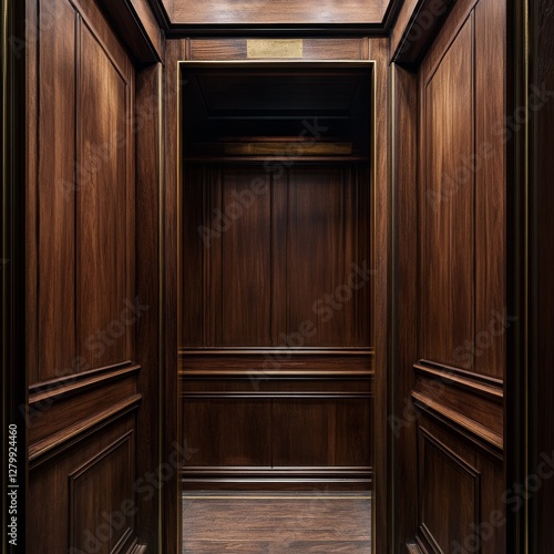 © Murad, Fototapeta premium Elegant Wood-Paneled Elevator Interior with Decorative Trim and Refined Detailing, Offering a Sense of Timeless Luxury.
