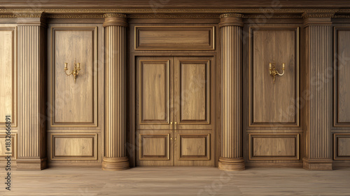 Naklejka premium Elegant wood-paneled room with double doors fluted columns and ornate wall...