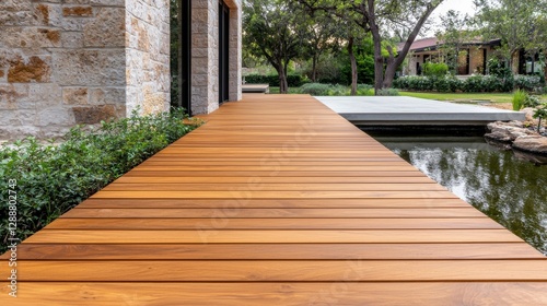 © ขวัญฤทัย เฉลาชาญชัยย, Obraz premium Elegant Wooden Deck Extending Over Natural Pond with Green Surroundings