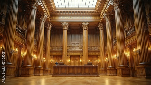 Obraz premium Elegant Wooden Hallway With Grand Columns and Skylight