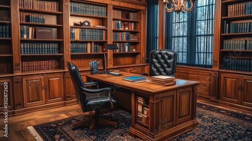 © SY, Fototapeta premium Elegant wooden office with large desk and bookshelves. Ideal for business, success, or luxury concepts.