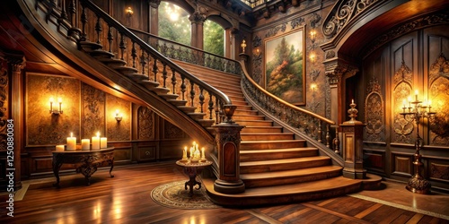© kanda, Obraz premium Elegant Wooden Staircase in Luxurious Vintage Interior Setting