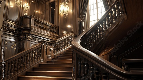 © Kitta Studio, Obraz premium Elegant Wooden Staircase with Ornate Details in Luxurious Interior