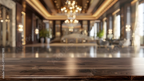 © JK_kyoto, Fototapeta premium Elegant wooden table surface with a blurred luxury hotel interior in the background, showcasing opulence and sophistication.