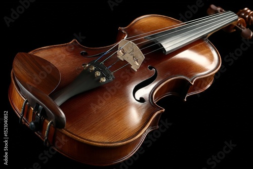 © ChaoticMind, Fototapeta premium Elegant wooden violin with polished finish placed on a dark background showcasing craftsmanship and design details