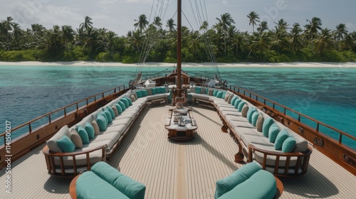 Obraz premium Elegant Yacht Deck with Cushions on a Tropical Island Coastline
