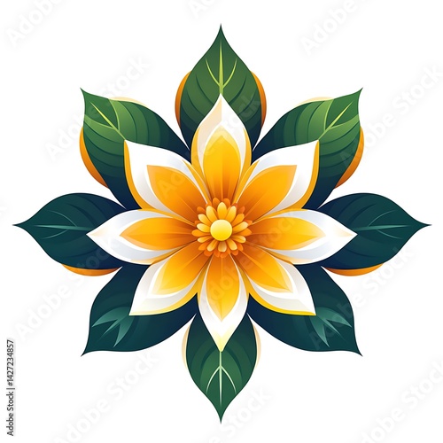 © Biplob, Fototapeta premium Elegant Yellow Flower Photo Illustration With Dark Green Leaves Ornamentation On White